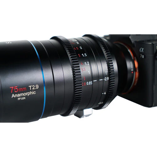The Sony E mount 75mm T2.9 Anamorphic 1.6x Lens, from Sirui, fills a theater screen with rich detail, cinematic bokeh, and artistic lens flairs. This full-frame lens produces oval bokeh and horizontal blue streaks, giving your footage a dreamy or science fiction aesthetic. An image captured in 16:9 is de-squeezed to an anamorphic 2.8:1 aspect ratio, whereas shooting in 3:2 yields a 2.4:1 final image.
